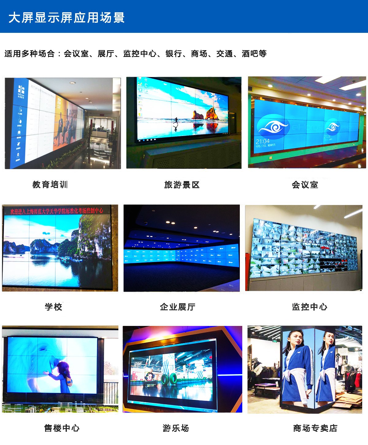 常見(jiàn)用用領(lǐng)域:大中小型會(huì)議室、企業(yè)展廳、舞臺(tái)、房地產(chǎn)、商用大屏廣告展示等。